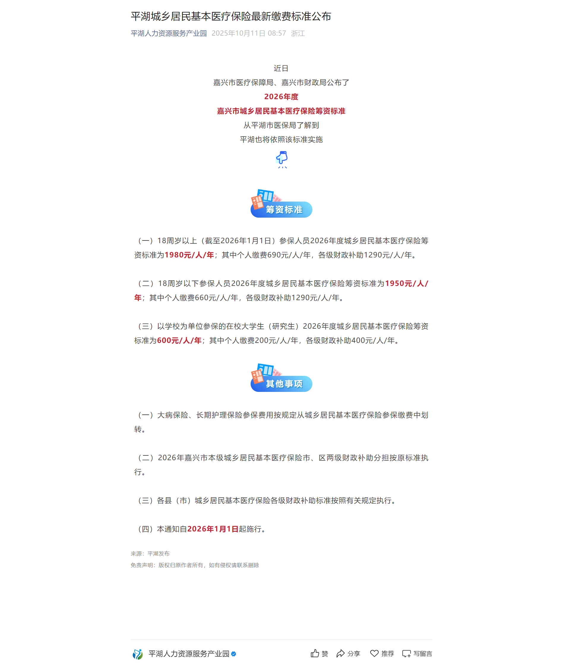 平湖城乡居民基本医疗保险最新缴费标准公布