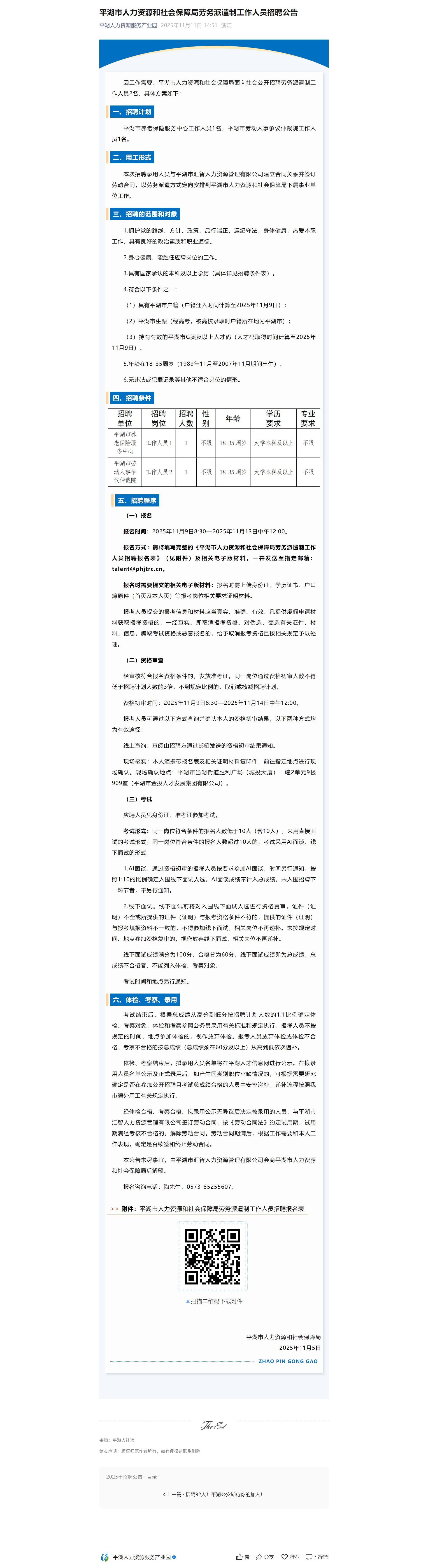 平湖市人力资源和社会保障局劳务派遣制工作人员招聘公告